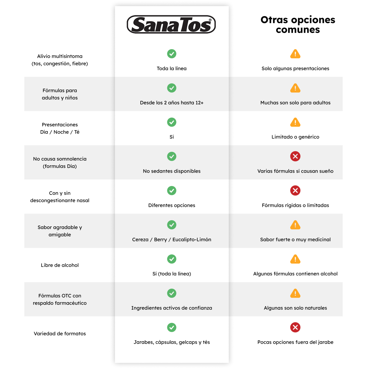 SanaTos ofrece fórmulas pensadas para brindar alivio efectivo a toda la familia, desde los más pequeños hasta los adultos, con presentaciones que se ajustan a cada etapa del día y a distintos niveles de síntomas.